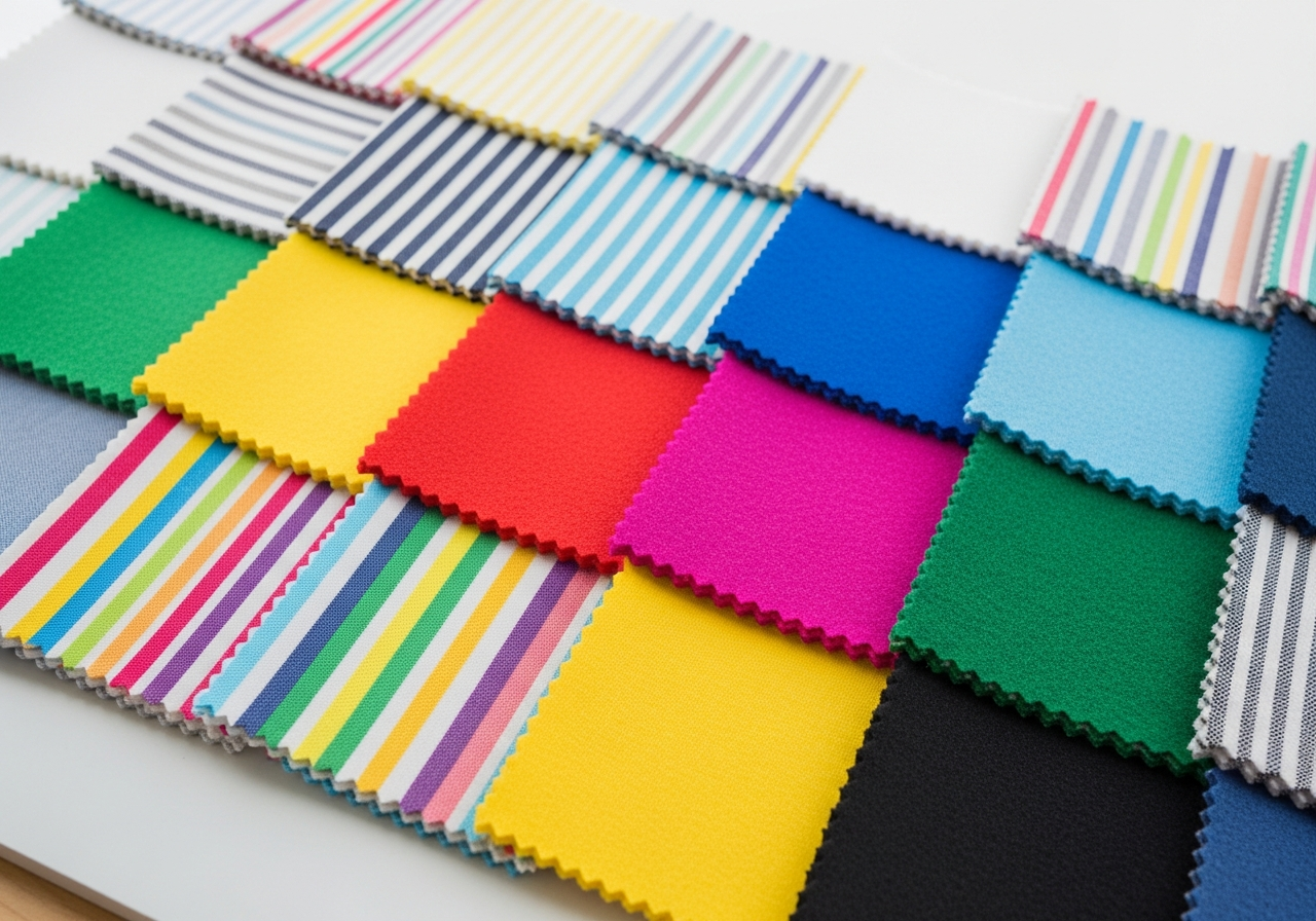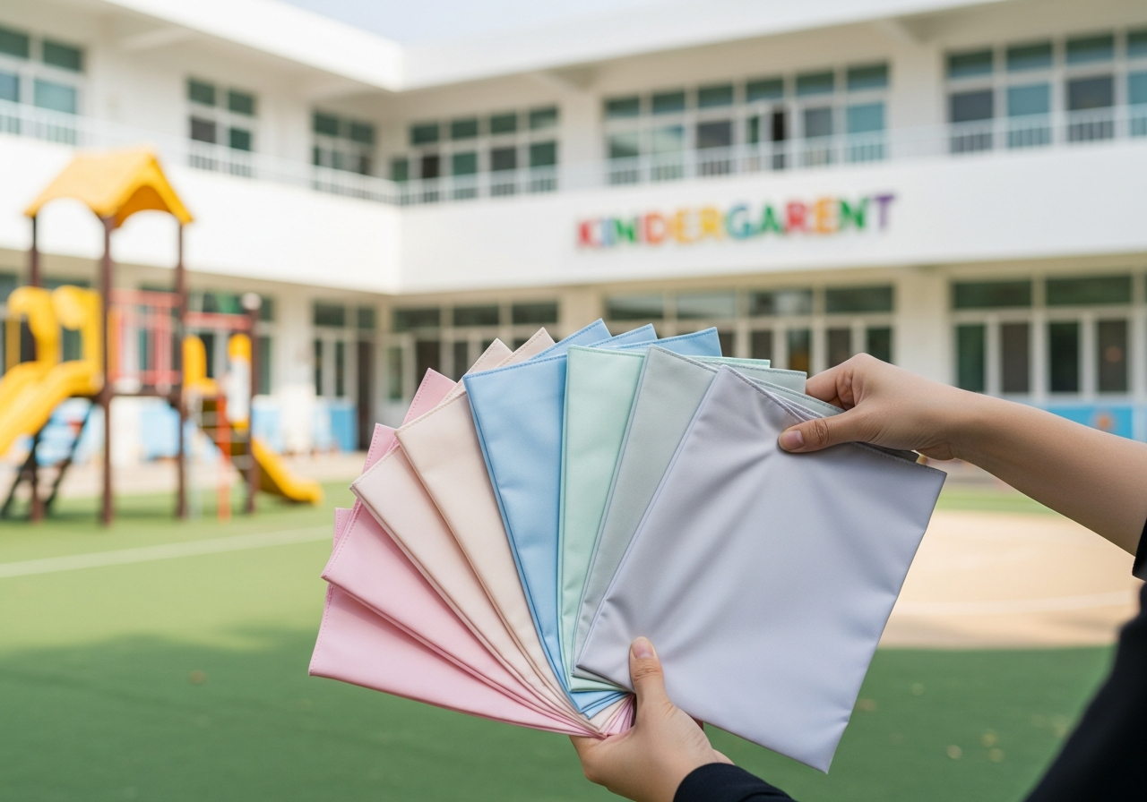 単色からストライプまで豊富なカラーバリエーションで、園舎・遊具・ブランドイメージとも調和。マット調の落ち着いた風合い。