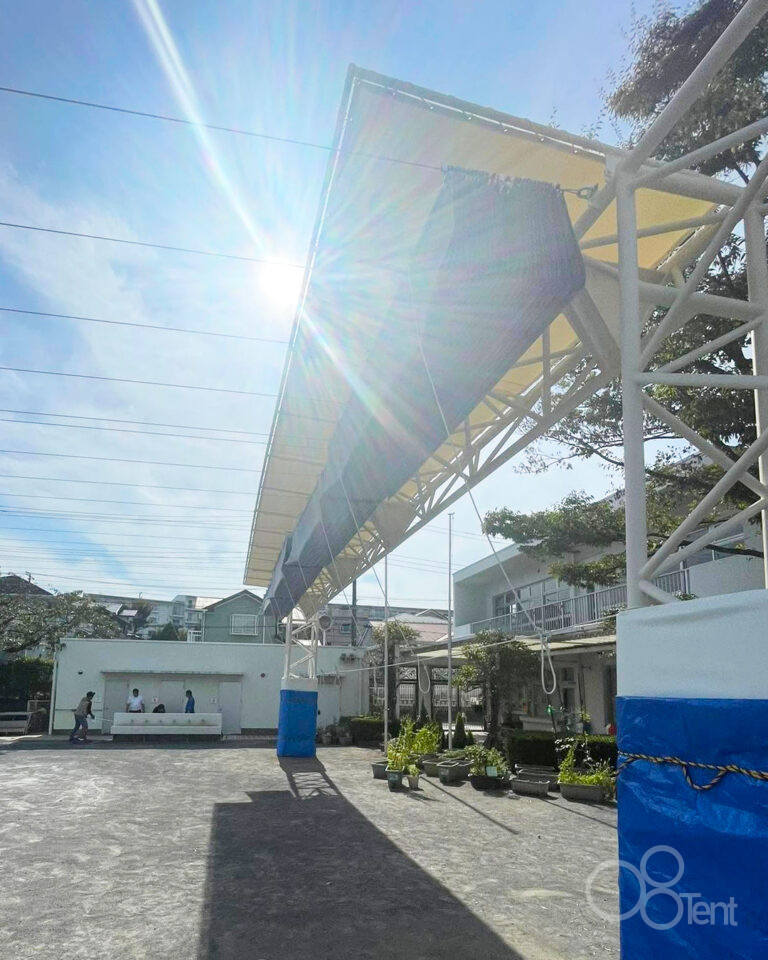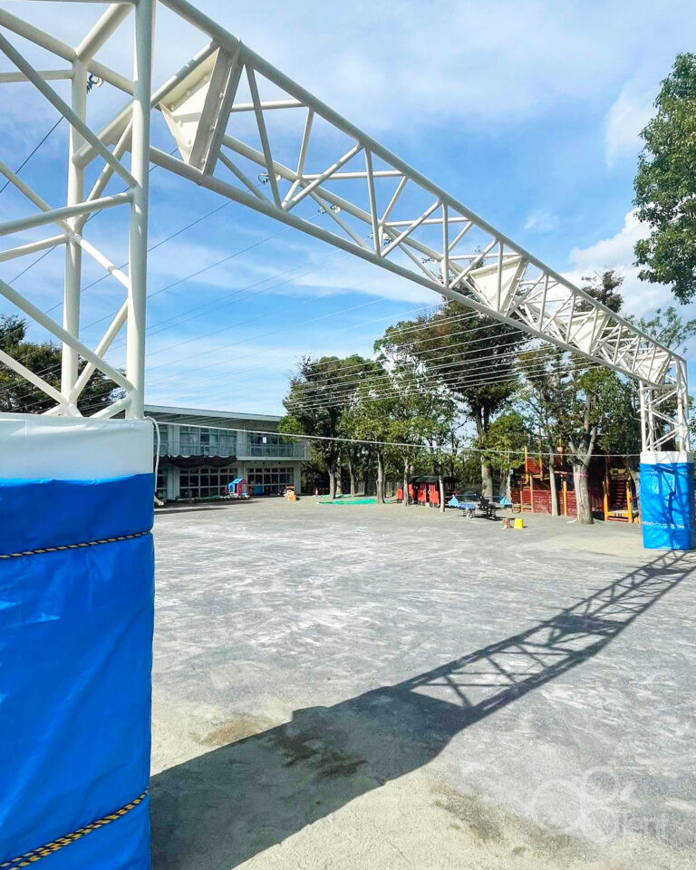 園庭全体を覆う大型の開閉式シェード(メッシュテント)を施工いたしました。 最大の特徴は、「ロープ一本で誰でも簡単に開閉できる」という操作性の良さです。急な雨や、日差しの変化に合わせて、現場の先生方が即座に屋根を広げたり畳んだりできる、実用性重視の熱中症対策システムです。