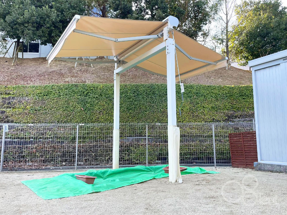 保育室前のテラススペースの幅広オーニング(電動式)については、シート張替え+オーニング本体の清掃も承りました。