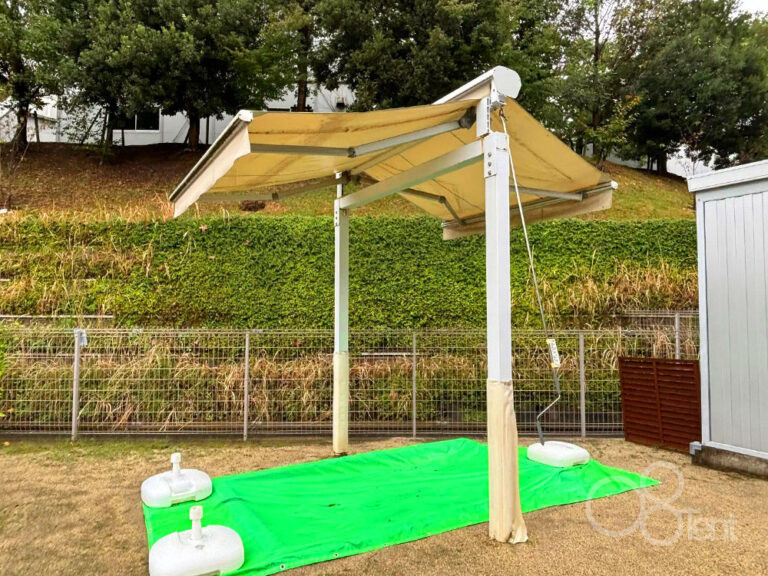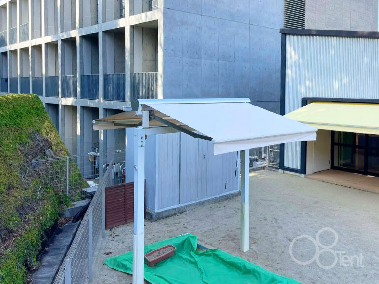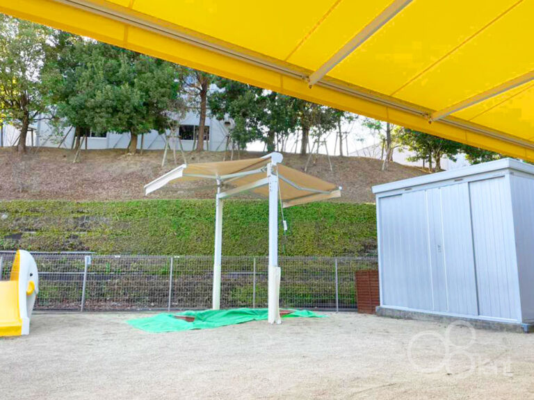 愛知県長久手市の大学内保育施設にて、保育室テラスのオーニングのシート張替え+砂場エリアのダブルオーニングの施工を承りました。