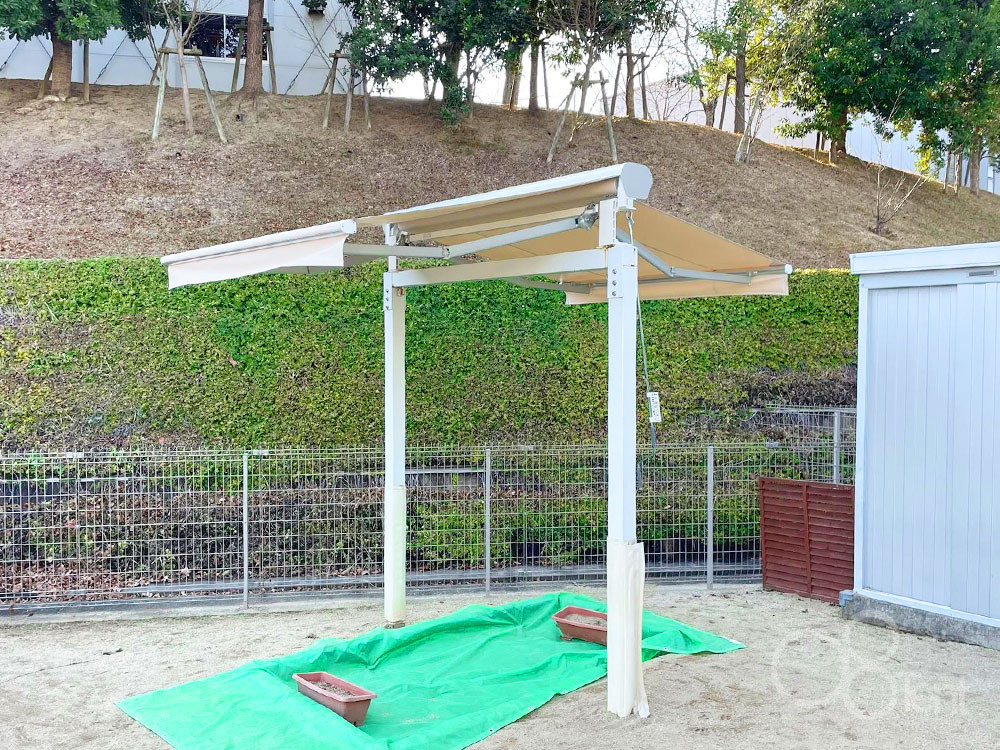 砂場スペースは、ダブルオーニングという両サイドに伸縮する手動式オーニングです。